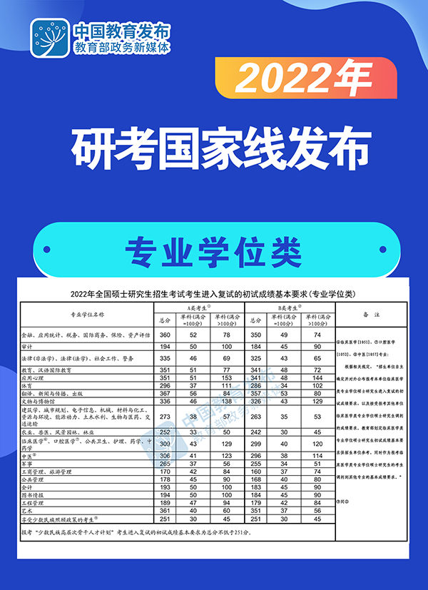 同日,教育部發(fā)布了《2022年全國碩士研究生招生考試考生進入復試的初試成績基本要求》(國家分數線)。各招生單位將根據《2022年全國碩士研究生招生工作管理規(guī)定》,在國家分數線的基礎上,自主確定并公布本單位各專業(yè)考生進入復試的要求。
