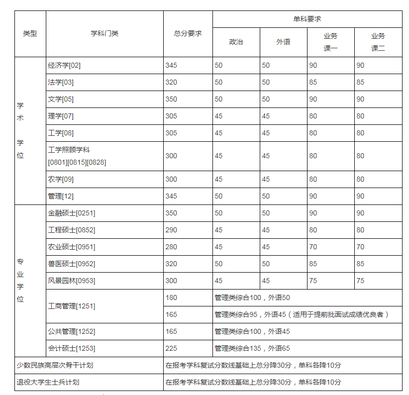 說明:1、上表為我?;緩驮嚪謹?shù)要求,生源充裕學院可根據(jù)整體考試情況、招生計劃、學科專業(yè)特點等,上調(diào)分數(shù)要求,但差額復試比例不得低于120%。報考該類學院的考生須達到學院公布的復試分數(shù)要求才能參加復試。學院調(diào)整后的復試分數(shù)線、復試辦法,由各院近日公布,請考生密切留意。