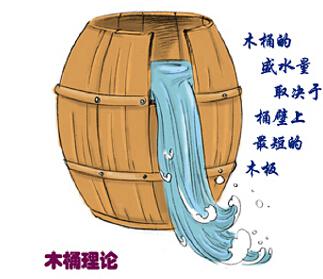 該理論由美國管理學家彼得提出:盛水的木桶是由許多塊木板箍成的,盛水量也是由這些木板共同決定的。若其中一塊木板很短,則盛水量就被短板所限制。這塊短板就成了木桶盛水量的“限制因素”。