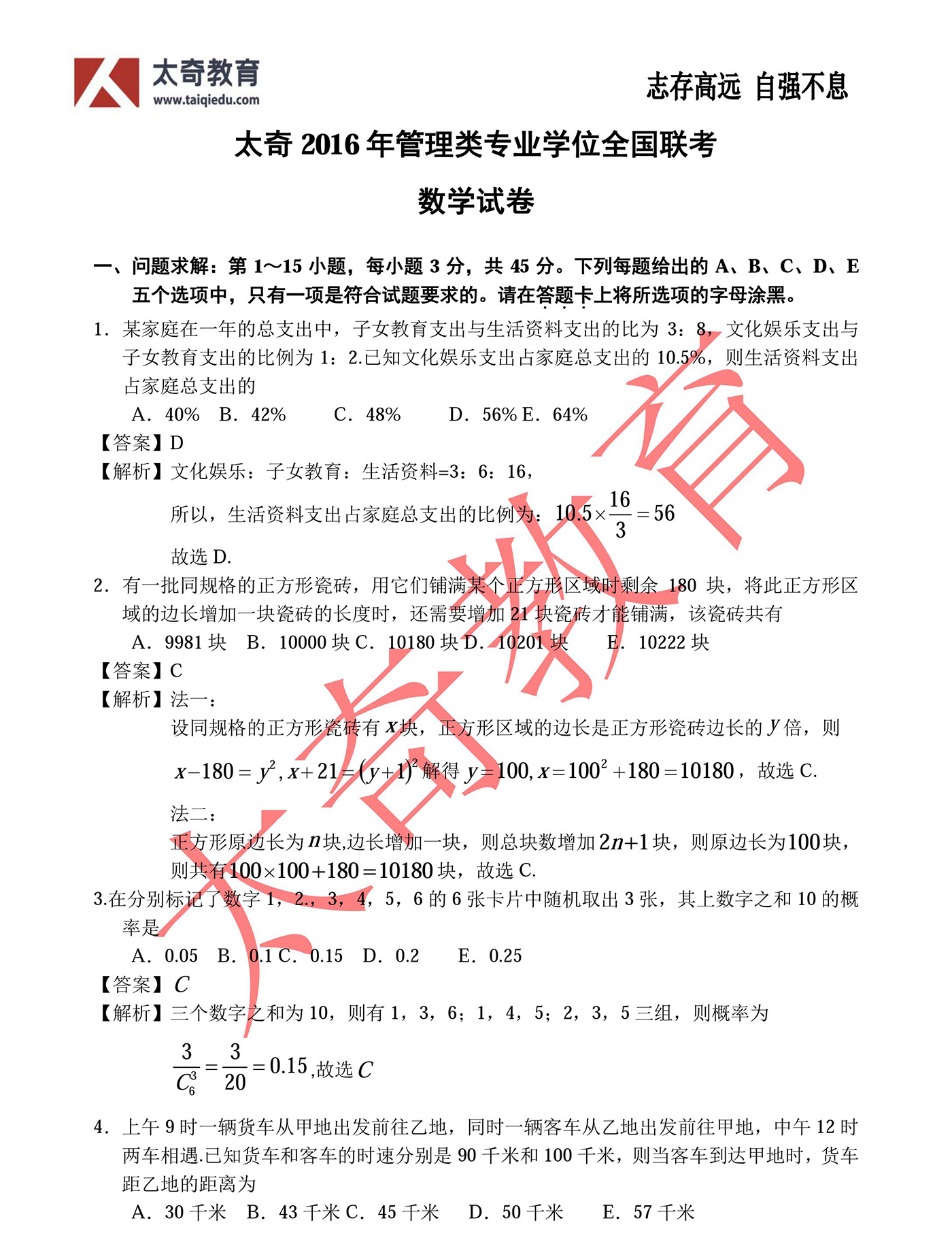 2016管理類(lèi)聯(lián)考數(shù)學(xué)真題完整解析(太奇官方版)
