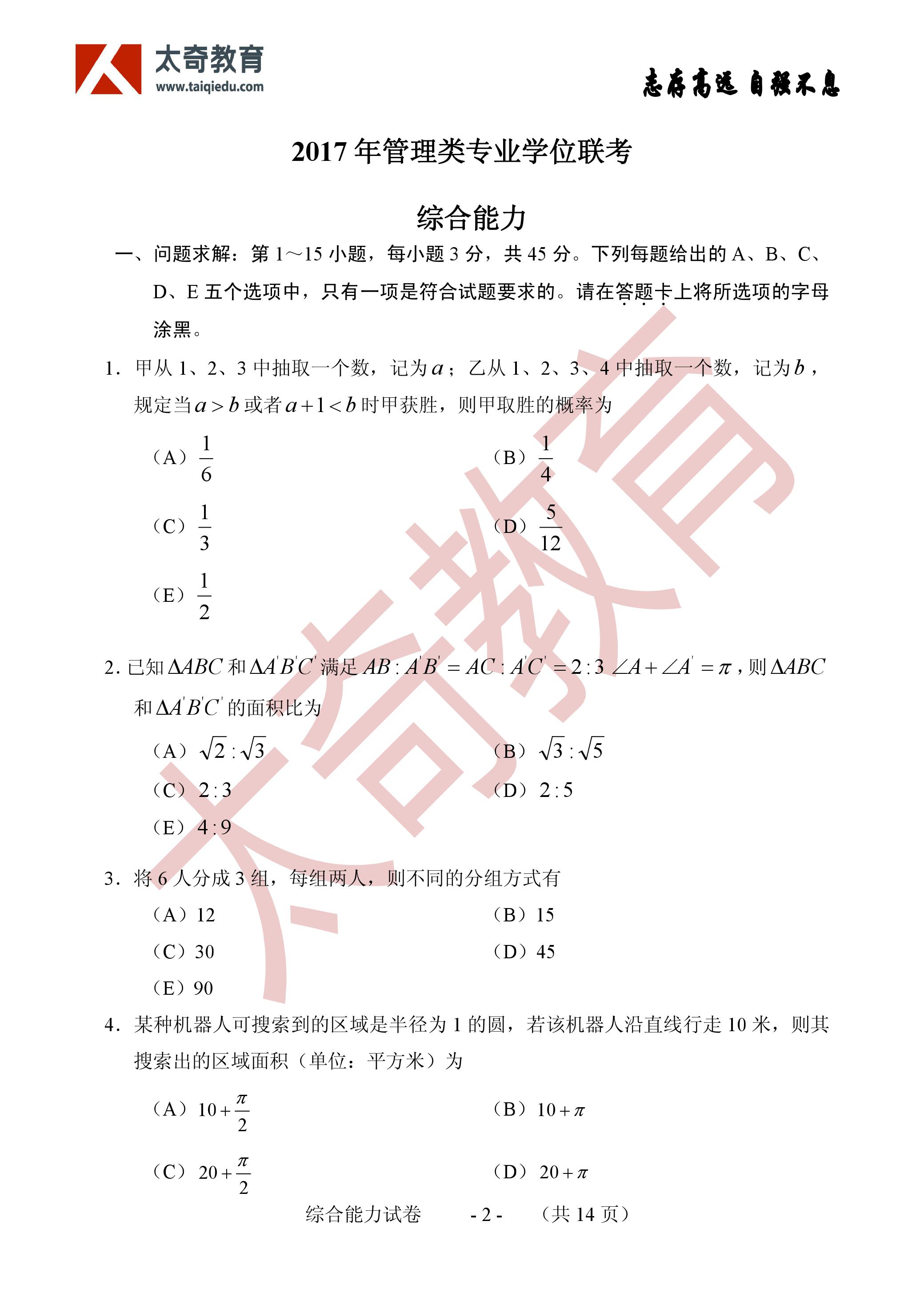 2017年MBA聯(lián)考數(shù)學(xué)真題參考答案:問題求解
