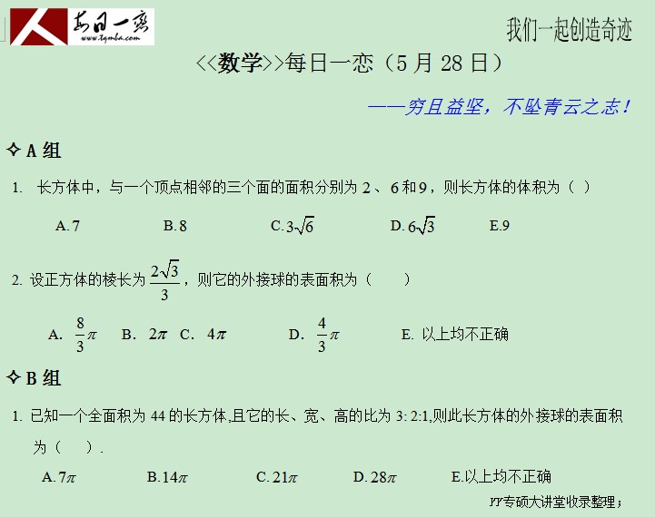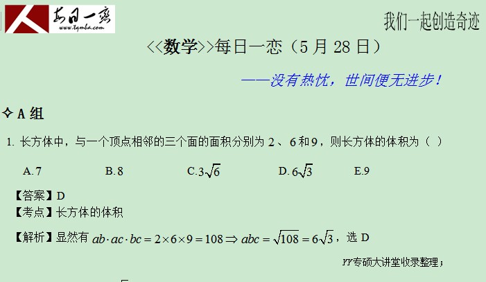 管理類(lèi)碩士官方備考群,考生互動(dòng),擇校評(píng)估,真題討論 點(diǎn)擊加入備考群>>從本周一(5月26日)開(kāi)始,每日一“戀”各科不再發(fā)放詳解,相關(guān)題目解析每周在太奇YY大講堂由老師進(jìn)行統(tǒng)一講解,每周課程在太奇YY大講堂萬(wàn)人備考群進(jìn)行公布,YY群號(hào):9444754 YY聽(tīng)課頻道:57378066