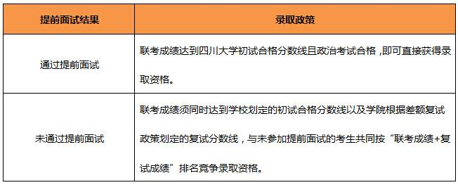 復(fù)試包括常規(guī)面試和政治考試,通過提前面試的考生參加政治考試合格則直接獲得錄取資格;未通過提前面試及未參加提前面試的考生參加政治考試合格后按照“聯(lián)考成績(jī)+面試成績(jī)”排名競(jìng)爭(zhēng)錄取資格。