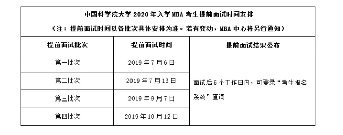 2、2019年6月至10月,中國科學(xué)院大學(xué)MBA教育管理中心將組織專家組對網(wǎng)上提交提前面試申請的考生進行綜合評估審核 ,在審核截止之前考生可繼續(xù)提交提前面試申請。