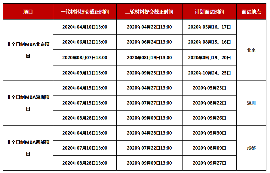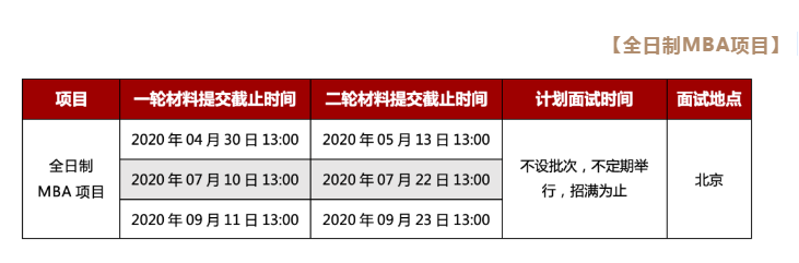 2021年非全日制MBA北京項目的一輪材料提交最終截止時間為2020年09月11日13:00,二輪材料提交最終截止時間為2020年09月23日13:00;