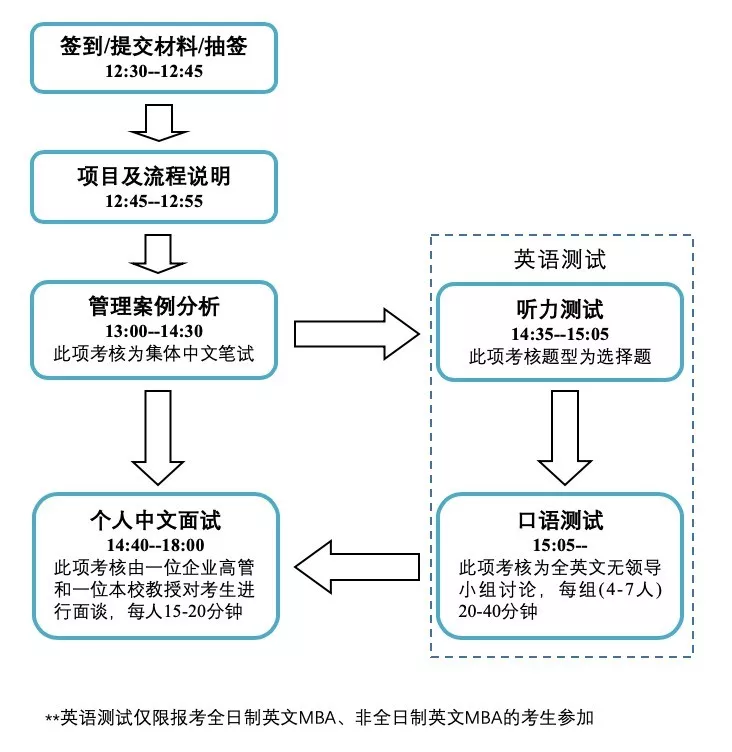 上外MBA預(yù)復(fù)試由管理案例分析、個人中文面試、英語測試(僅限報(bào)考全日制英文MBA、非全日制英文MBA的考生參加)三個環(huán)節(jié)構(gòu)成。具體流程安排如下: