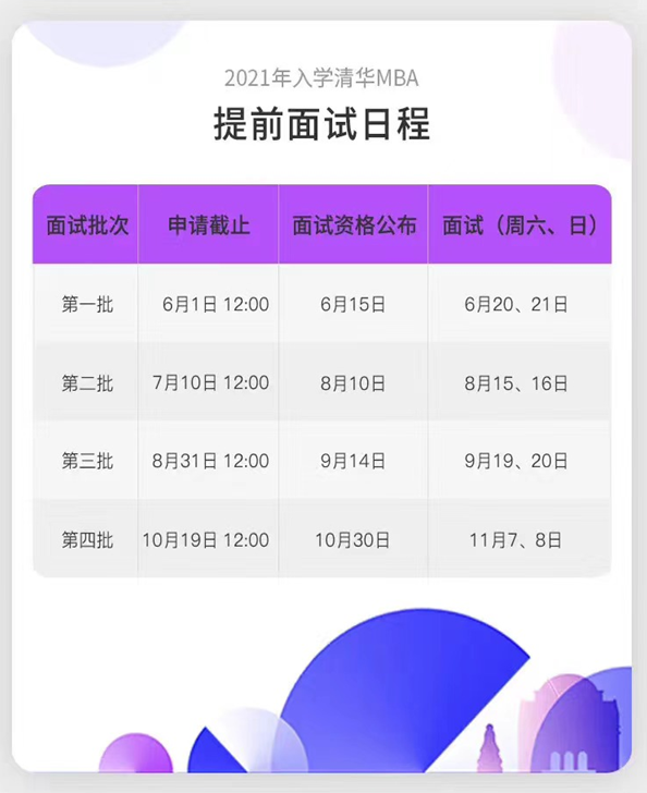 2021年清華MBA的日程安排(材料截止及面試時間)和往年相比差別不大,但第一批面試6月份的時候北京疫情形勢不太樂觀,所以面試時間都延后了,故第一批材料通過,需要面試的同學(xué)們都被迫在第二批面試時候選擇第二或者后三四批次來面試。
