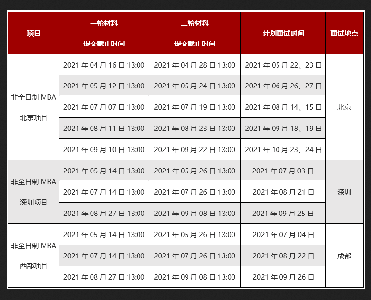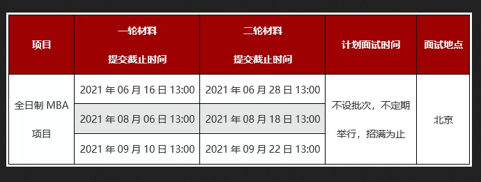 2022年非全日制MBA北京項目的一輪材料提交最終截止時間為2021年09月10日13:00,二輪材料提交最終截止時間為2021年09月22日13:00;2022年非全日制MBA深圳、西部項目的一輪材料提交最終截止時間為2021年08月27日13:00,二輪材料提交最終截止時間為2021年09月08日13:00。申請人必須在此之前在線填寫材料,檢查無誤后直接在線提交。