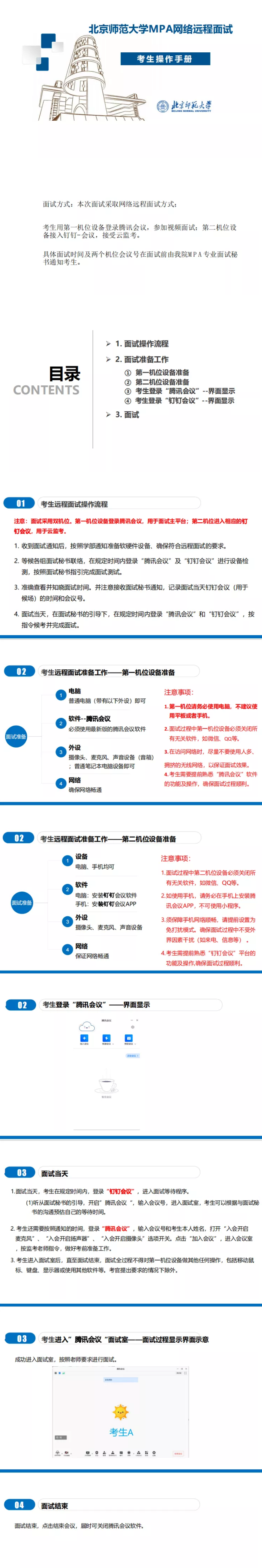 1.測試:考生提前準備好網(wǎng)絡環(huán)境及所需軟硬件條件,于9月24日,登錄主、副平臺,按學院要求完成測試。(請務必確保9月23日前已按要求做好軟硬件、網(wǎng)絡及物理空間的相應準備,測試環(huán)境應與面試當天環(huán)境一致;兩臺設備應按照主副平臺分別安裝好騰訊會議和釘釘軟件,并自行測試確保其能正常使用,音視頻效果良好。具體測試時間和方式將通過電話、短信通知,請保持手機暢通。)