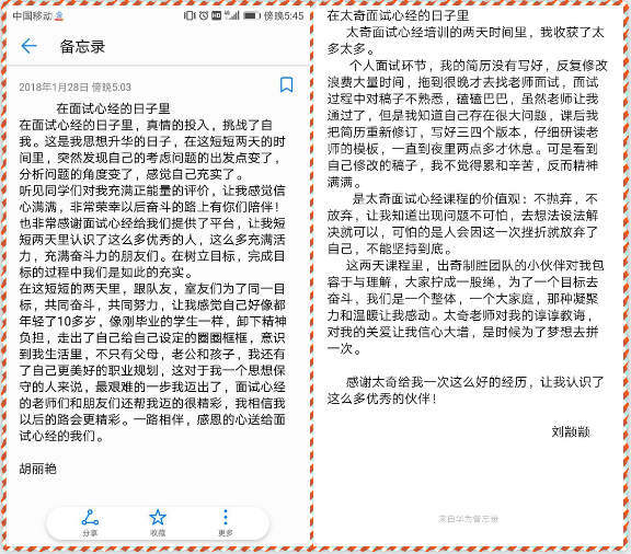 隨著太奇面試輔導不斷進行,同學們的參與感也愈發(fā)強烈,從最初清晰自己職業(yè)規(guī)劃,到后面的案例討論小組對抗、材料撰寫現場點評,再到最后的自我介紹現場驗收。182期所有參營面試學員一起認真活動,全力以赴的對待每一個環(huán)節(jié),不斷的突破學習、積累經驗和開闊視野。共享過程用心體會,有歡歌笑語也有智慧對沖,真實的做到突破自我追求卓越。