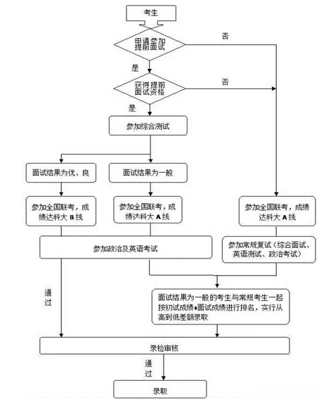 1.“提前面試”招生方式。采取“提前面試申請、背景評估、提前面試(綜合素質(zhì))、網(wǎng)上報名、現(xiàn)場確認(rèn)、全國聯(lián)考、復(fù)試(政治理論考試和英語面試)、正式錄取”的方式進行。凡符合教育部規(guī)定的MBA報考條件的考生均可申請?zhí)崆芭嬖?,面試結(jié)果達(dá)到要求的考生享受相應(yīng)的專項政策。