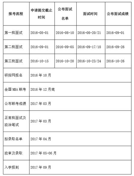 2017年MBA招生將采取提前批面試方式。提前批面試取得“條件錄取資格”計(jì)劃數(shù)為招生計(jì)劃總數(shù)的50%。(詳細(xì)方案見第六部分)