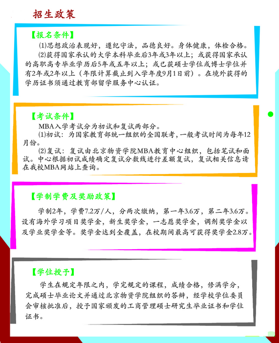 北京物資學院于2010年獲工商管理碩士(MBA)專業(yè)學位授予權,學校成立了專門培養(yǎng)機構MBA教育中心,在學校研究生部統(tǒng)一指導下進行MBA專業(yè)學位教育及管理工作,以服務社會,培養(yǎng)符合時代發(fā)展要求的工商企業(yè)管理精英和骨干為主要目標。MBA的培養(yǎng)將充分發(fā)揮我校學科優(yōu)勢和特色,結合社會發(fā)展趨勢和企業(yè)實際經(jīng)營需要,側重對MBA學員進行管理實踐與應用方面的訓練,培養(yǎng)學員良好的專業(yè)素養(yǎng)和職業(yè)道德,掌握堅實的基礎理論知識,具備寬廣的現(xiàn)代管理、經(jīng)濟及相關法律知識,了解當代中國經(jīng)濟、技術與社會發(fā)展的新趨勢和現(xiàn)代管理理論的新發(fā)展,能夠勝任工商企業(yè)和經(jīng)濟管理等部門的管理工作。