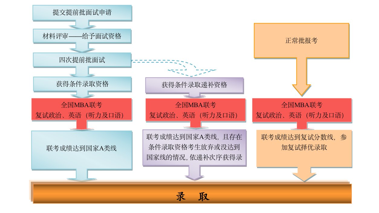 登錄中國(guó)人民大學(xué)商學(xué)院MBA項(xiàng)目中心網(wǎng)站“考生服務(wù)系統(tǒng)”,按照規(guī)定時(shí)間提交網(wǎng)上申請(qǐng)材料,學(xué)院將組織專(zhuān)家評(píng)審申請(qǐng)材料,擇優(yōu)給予提前面試資格并組織面試。面試后獲得條件錄取資格和條件錄取遞補(bǔ)資格的考生需參加2020年12月底舉行的全國(guó)聯(lián)考。