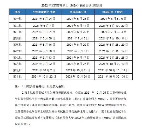因2022年全國(guó)碩士研究生招生考試網(wǎng)上報(bào)名時(shí)間較往年有提前,北師大2022年MBA的提前面試批次及時(shí)間安排做出調(diào)整,最新見(jiàn)下圖及說(shuō)明。