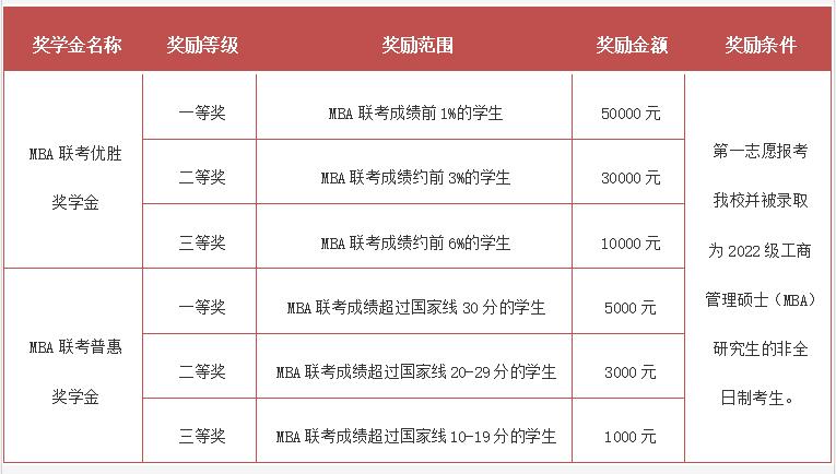 為了鼓勵(lì)優(yōu)秀人才攻讀非全日制工商管理碩士(MBA),培養(yǎng)更多品學(xué)兼優(yōu)的商界精英,北京交通大學(xué)MBA教育中心特設(shè)立MBA聯(lián)考優(yōu)勝獎(jiǎng)學(xué)金、MBA聯(lián)考普惠獎(jiǎng)學(xué)金。其獎(jiǎng)勵(lì)范圍、獎(jiǎng)金額度和獎(jiǎng)勵(lì)對(duì)象如表二所示。2022級(jí)非全日制MBA新生獎(jiǎng)學(xué)金評(píng)選辦法詳見(jiàn)后續(xù)通知。若有變動(dòng),均以具體通知為準(zhǔn)。