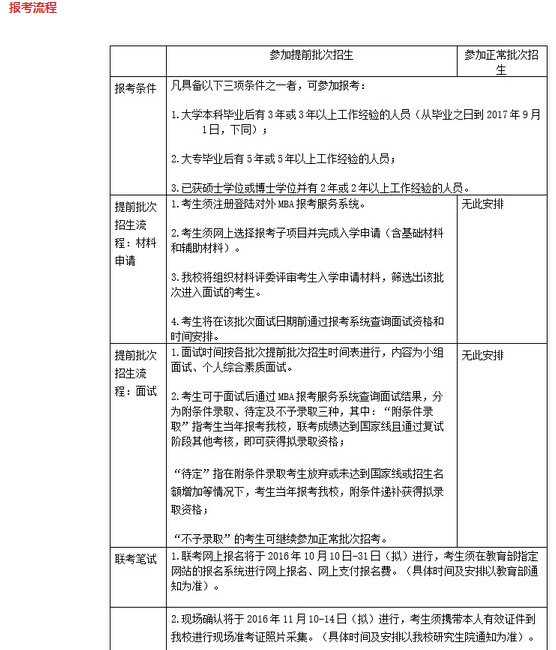 4. “MBA提前批次招生”將安排于2016年5月至11月進(jìn)行,參加提前批次招生的考生需在聯(lián)考報(bào)名前的指定期間內(nèi)在線提交申請(qǐng)材料,經(jīng)過材料評(píng)審,擇優(yōu)給予面試資格;經(jīng)過面試給予綜合素質(zhì)優(yōu)秀的考生“附條件錄取”資格;原則上,該類考生參加全國(guó)聯(lián)考成績(jī)達(dá)到國(guó)家A線即可錄取。