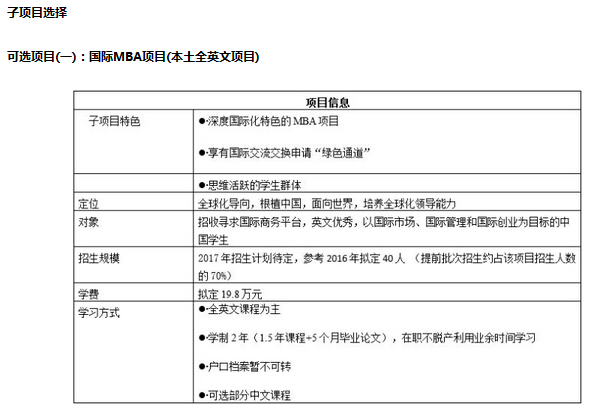 1. 招生類別分為兩個(gè)子項(xiàng)目:國(guó)際MBA項(xiàng)目(本土全英文)、在職MBA項(xiàng)目。兩個(gè)項(xiàng)目設(shè)置獨(dú)立的招生標(biāo)準(zhǔn),分別招生,在簡(jiǎn)歷評(píng)審、面試選拔等環(huán)節(jié)各自排序。申請(qǐng)任意子項(xiàng)目并獲得附條件錄取資格后,原則上不做任何項(xiàng)目調(diào)整。