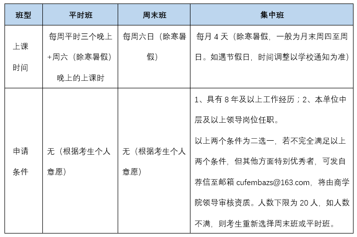答:非全日制考生在提前批面試階段選擇的班型僅為初步意向??忌稍跀M錄取結(jié)果公示后,即2020年4月中下旬,在中財MBA招生系統(tǒng)中最終確認班型。各班型上課時間及申請條件如下圖:
