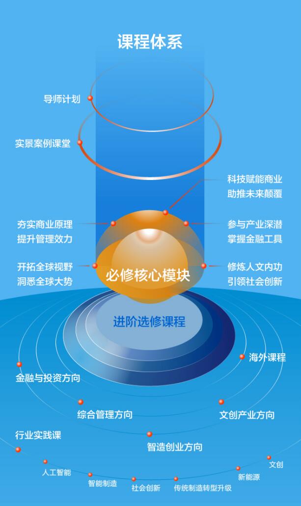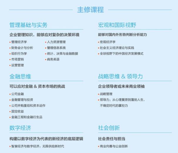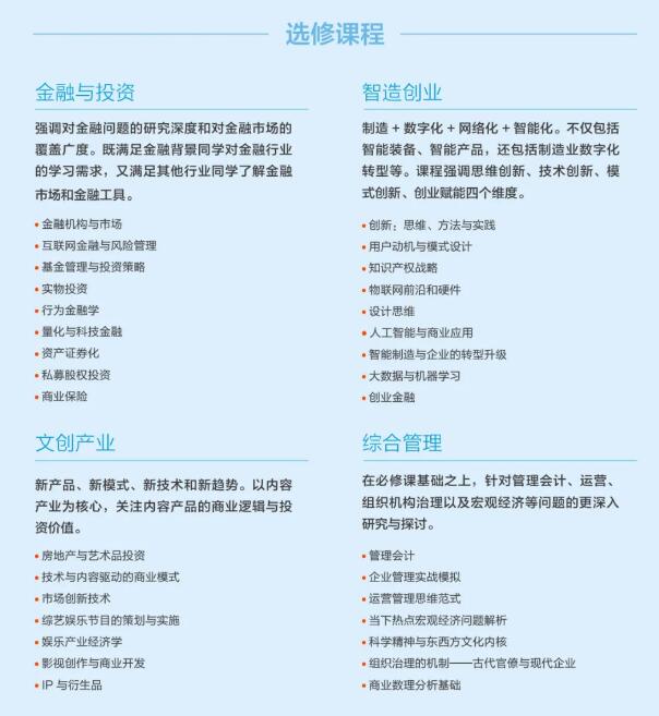 長江商學(xué)院MBA項(xiàng)目結(jié)合學(xué)院的差異化優(yōu)勢(shì),在基礎(chǔ)核心課程之外,還圍繞金融與投資、智造創(chuàng)業(yè)、文創(chuàng)產(chǎn)業(yè)三個(gè)最具潛力的賽道以及綜合管理方向, 開設(shè)了豐富的選修課程,并通過多樣的行業(yè)實(shí)踐課程使同學(xué)保持對(duì)行業(yè)前沿趨勢(shì)的敏銳度,通過特色的海外課程提高同學(xué)的視野、實(shí)現(xiàn)資源跨界整合, 用多元的行業(yè) 講座和實(shí)景案例課堂給學(xué)生提供更充實(shí)的學(xué)習(xí)體驗(yàn)。