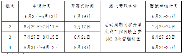 3.“MBA優(yōu)選計(jì)劃”活動(dòng)分四批次進(jìn)行。每批次資格審核通過(guò)的考生須通過(guò)MBA教育中心網(wǎng)站查看當(dāng)次活動(dòng)通知,并按通知要求參加各項(xiàng)活動(dòng)。