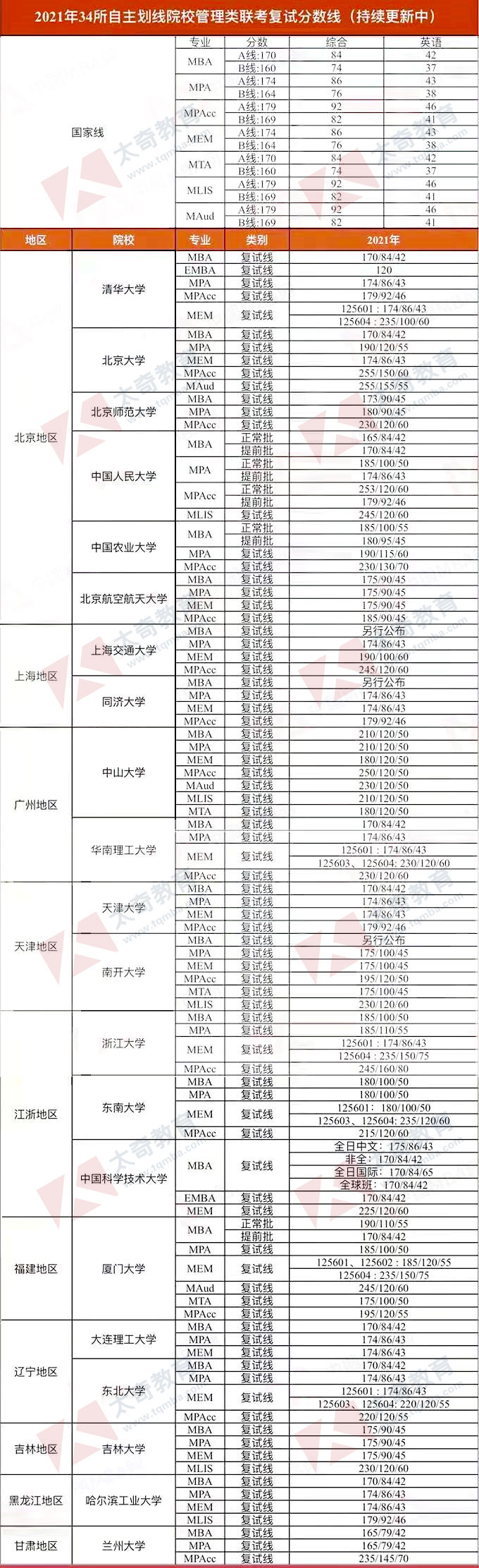2021年國家線及34所自劃線的各高校MBA復(fù)試基本分?jǐn)?shù)線匯總,有需要的小伙伴快收藏!