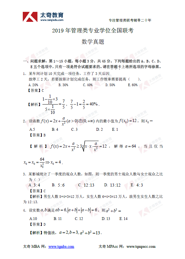 2019年MBA/MPAcc管理類(lèi)聯(lián)考數(shù)學(xué)真題及答案