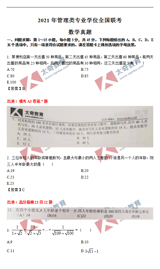 太奇2021年MBA管理類聯(lián)考數(shù)學(xué)真題命中對照