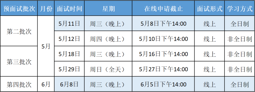 大家好!感謝您申請2023年入學(xué)華東師范大學(xué)MBA項目預(yù)面試?,F(xiàn)階段因處于疫情防控階段,為方便考生,暫定全日制與非全日制預(yù)面試均采用線上形式(具體以郵件通知為準(zhǔn))。5月11日(全日制)預(yù)面試現(xiàn)因人數(shù)已滿,報名通道已提前自動關(guān)閉。現(xiàn)已開啟5月12日、5月18日(非全日制)和6月8日(全日制)預(yù)面試報名通道(具體詳見下圖,我們會根據(jù)實際情況逐步開放后期批次),因每一批次名額有限,人滿系統(tǒng)將提前自動關(guān)閉報名通道。預(yù)面試時間持續(xù)更新中,請隨時關(guān)注官方微信公眾號與官方網(wǎng)站。面試需注意事項將于面試前一周內(nèi)以官方郵件形式發(fā)送至各位考生申請時預(yù)留郵箱,請注意查收。