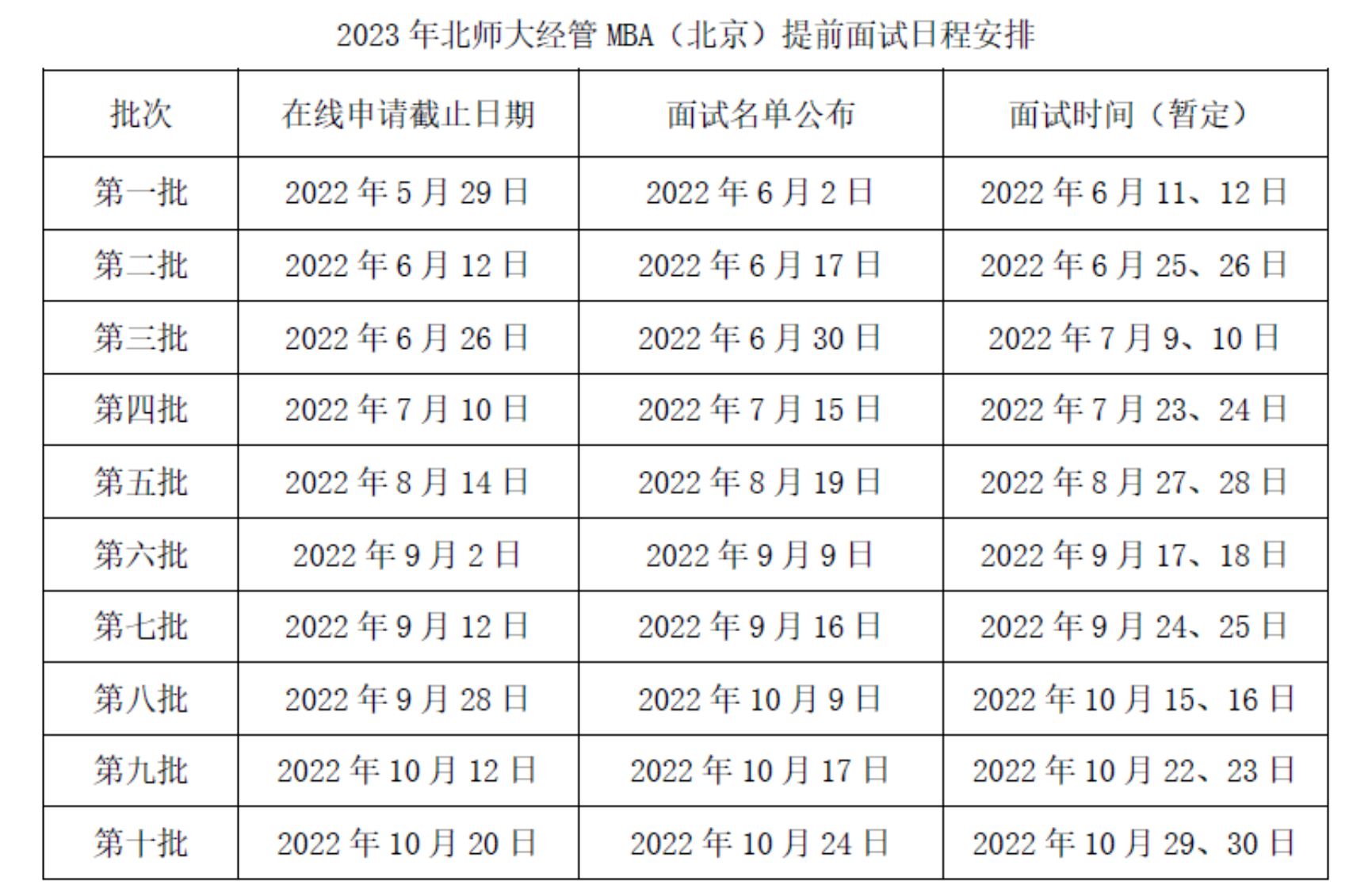 2. 第十批提前面試考生如果獲得面試資格,必須在2022年10月25日全國統(tǒng)考報名截止前完成北師大經(jīng)管MBA(北京)報名,全國統(tǒng)考報名選擇北師大經(jīng)管MBA(北京),否則不能參加第十批面試(其他未獲得面試資格、面試不通過,或未申請北師大經(jīng)管MBA(北京)提前面試的考生,全國統(tǒng)考報名請勿選擇北師大經(jīng)管MBA(北京)。第十批提前面試考生須在正式面試前知悉并簽署相應《北京師范大學經(jīng)濟與工商管理學院2023年工商管理碩士(MBA)提前面試風險告知書》。
