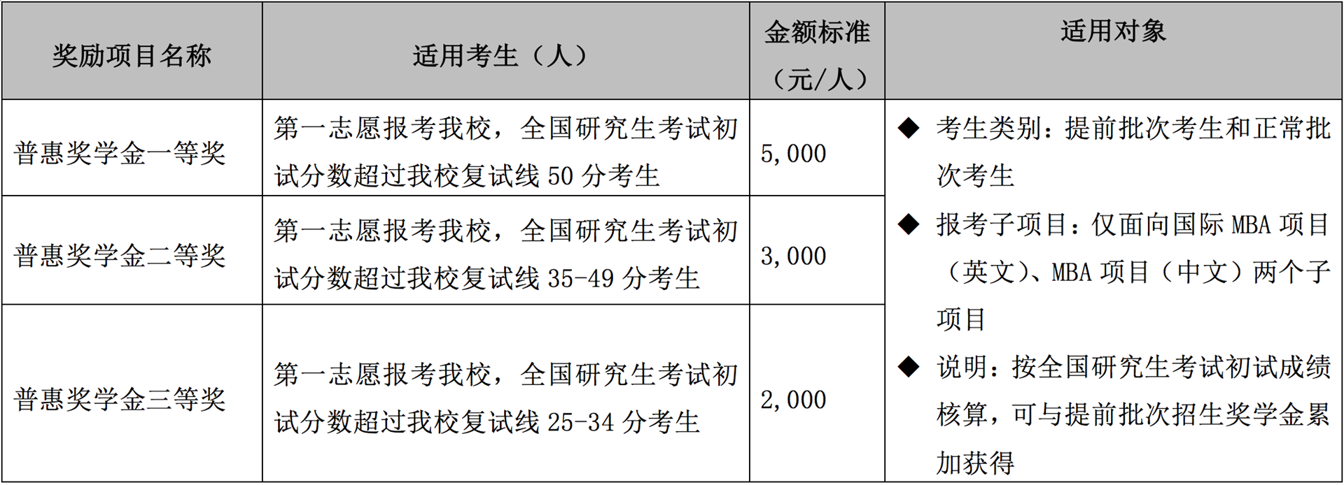 設(shè)立四種類別入學(xué)獎學(xué)金,以資鼓勵報考我校MBA/EMBA項目、全國研究生考試初試分數(shù)成績優(yōu)秀、提前批次招生面試表現(xiàn)出色的考生。