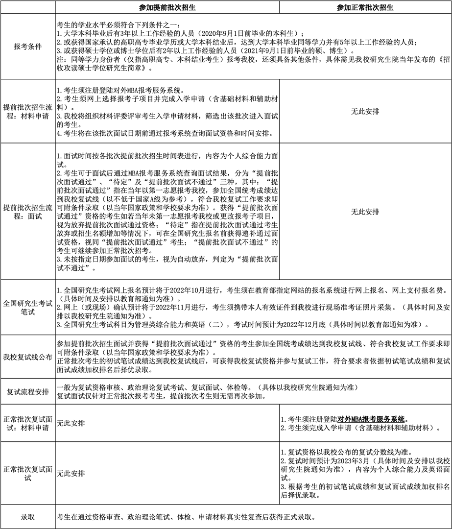 4.“MBA提前批次招生”將安排于2023年6月至10月進行,參加提前批次招生的考生須在全國研究生考試報名前的指定期間內(nèi)在線提交申請材料,經(jīng)過材料評審,擇優(yōu)給予面試資格;經(jīng)過面試環(huán)節(jié)擇優(yōu)給予綜合素質(zhì)優(yōu)秀的考生“提前批次面試通過”資格;原則上,參加提前批次招生面試并獲得“提前批次面試通過”資格的考生參加全國統(tǒng)考成績達到我校復(fù)試線(以不低于國家A線為參考),符合我校復(fù)試工作要求即可附條件錄?。ㄒ援?dāng)年國家政策和學(xué)校要求為準)。獲得“提前批次面試通過”資格的考生如若當(dāng)年未第一志愿報考我?;蚋膱罂甲禹椖?,視為放棄提前批次面試通過資格。